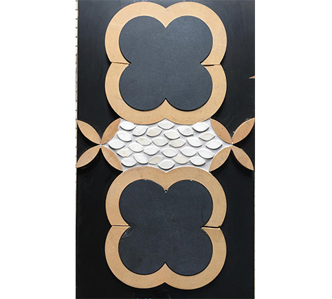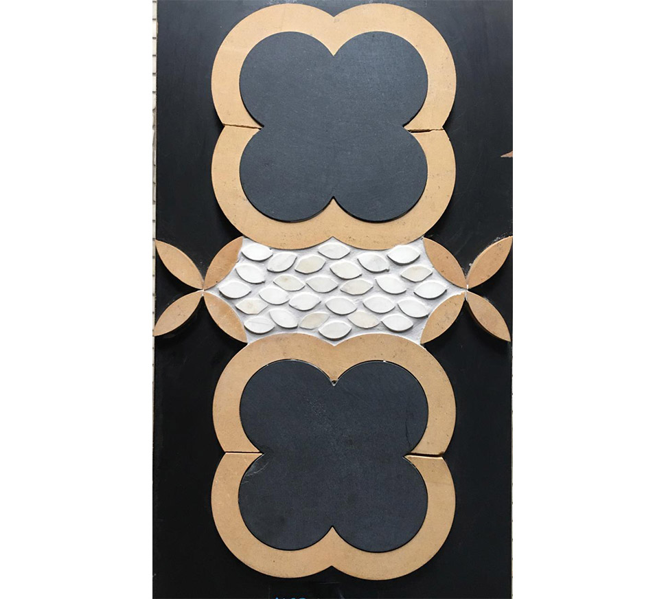 STONE MOSAIC PAVING D.NO.WJ-1, NERO, GIALLO, INDIAN CREMA, FLOWER DESIGN- NERO & GIALLO, LEAF DESIGN- GIALLO & WHITE